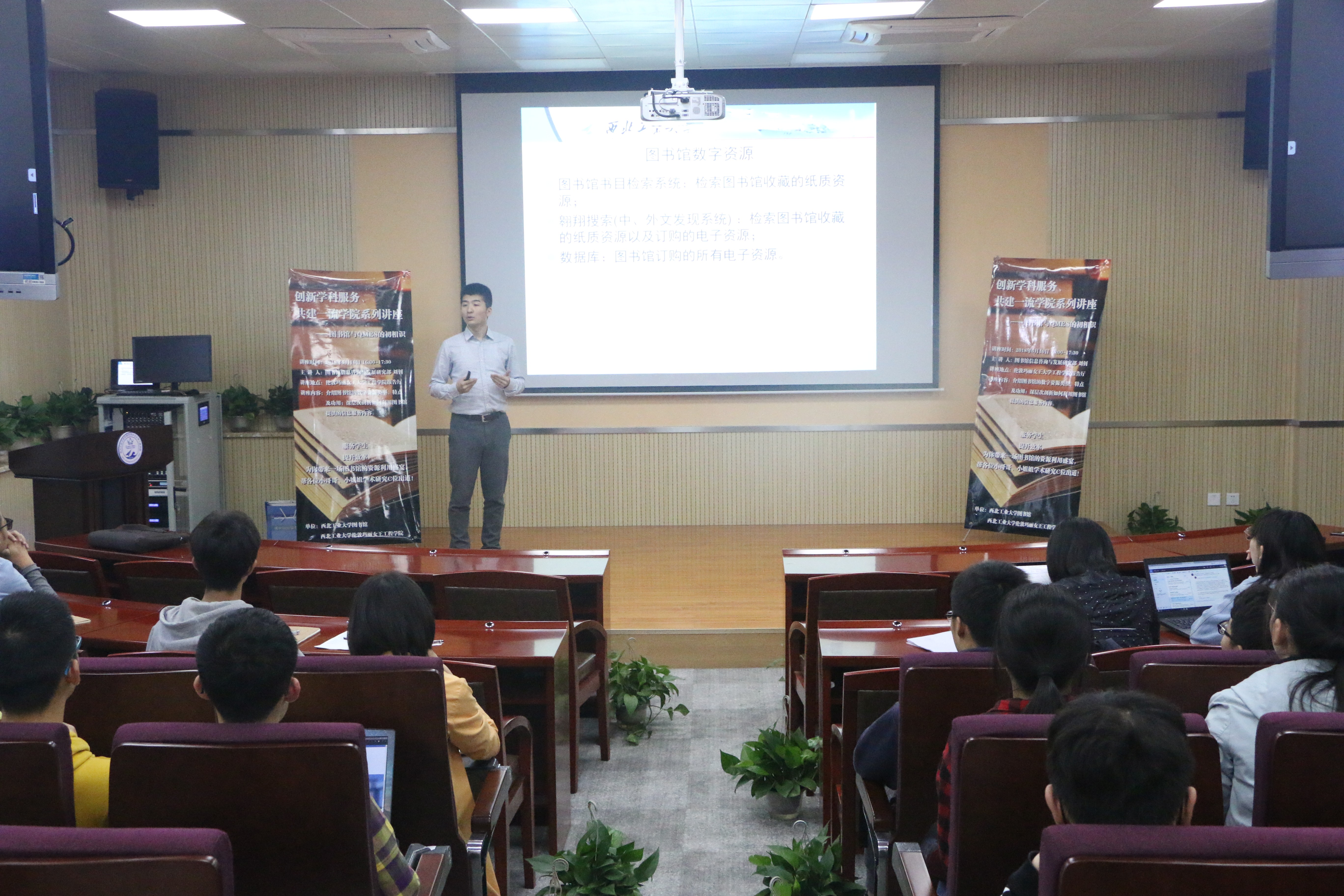 刘钊老师以“图书馆与QMES的初相识”为主题,为同学们简要说明了图书馆的各服务部门,全面介绍了图书馆的数字资源类型、特点及其功能并详细讲解了如何利用图书馆提供的信息,例如如何借阅下载中外文纸质、电子资源,如何荐购所需书籍,以及如何预约研修室等。