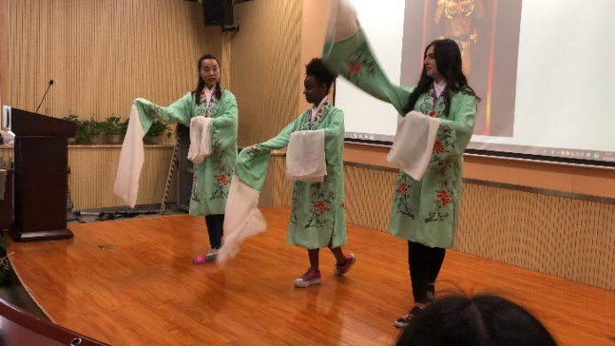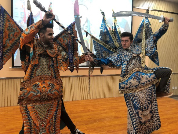 在体验京剧服装环节,员工大使Jesus和Matteo身着武将衣,手持双刀长枪,像是两位戎马疆场的大将。Arza、Nikita、Weronica和Phoebe四位女生则身穿青衣服饰,舞动水袖,轻移莲步,举止神情宛若中国古时的大家闺秀。两位陪同的英方老师Maria与Gabriel亦耐不住好奇,也换上京剧服装,体验了中国国粹之美。