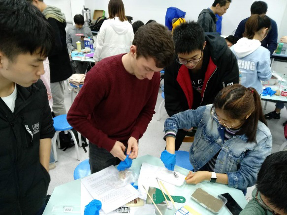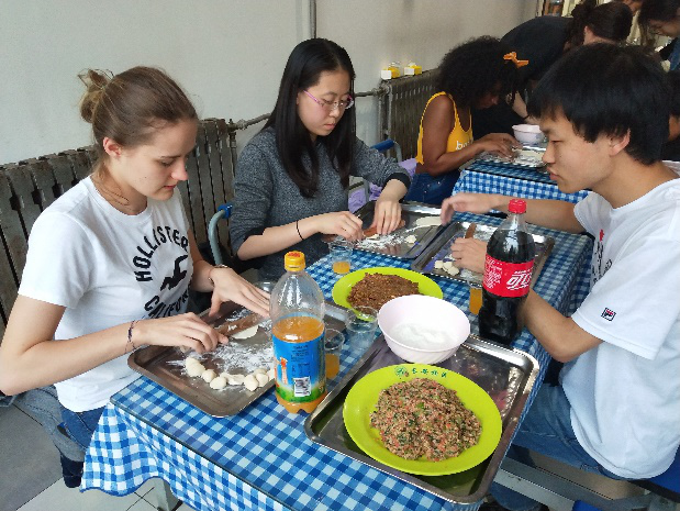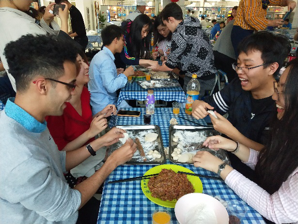 饺子,作为中国文化的标志性符号,代表着“家”的温暖。志愿者们又怎能错过与员工大使们一同体验“家人”温暖的机会呢?4月11日晚上,大家一起挽起袖子,拿起擀面杖,有模有样地学起了包饺子。他们交错而坐,边演示包饺子的方法边聊天。兴许是饺子拉近了彼此的距离,聊天的内容也不再单调,开始说笑玩闹,互相“吐槽”彼此的饺子形状,各桌之间甚至开始比赛包的速度,外教Gabriel也调皮地到处“偷”饺子,大家包得热火朝天,不时传来欢声笑语。
