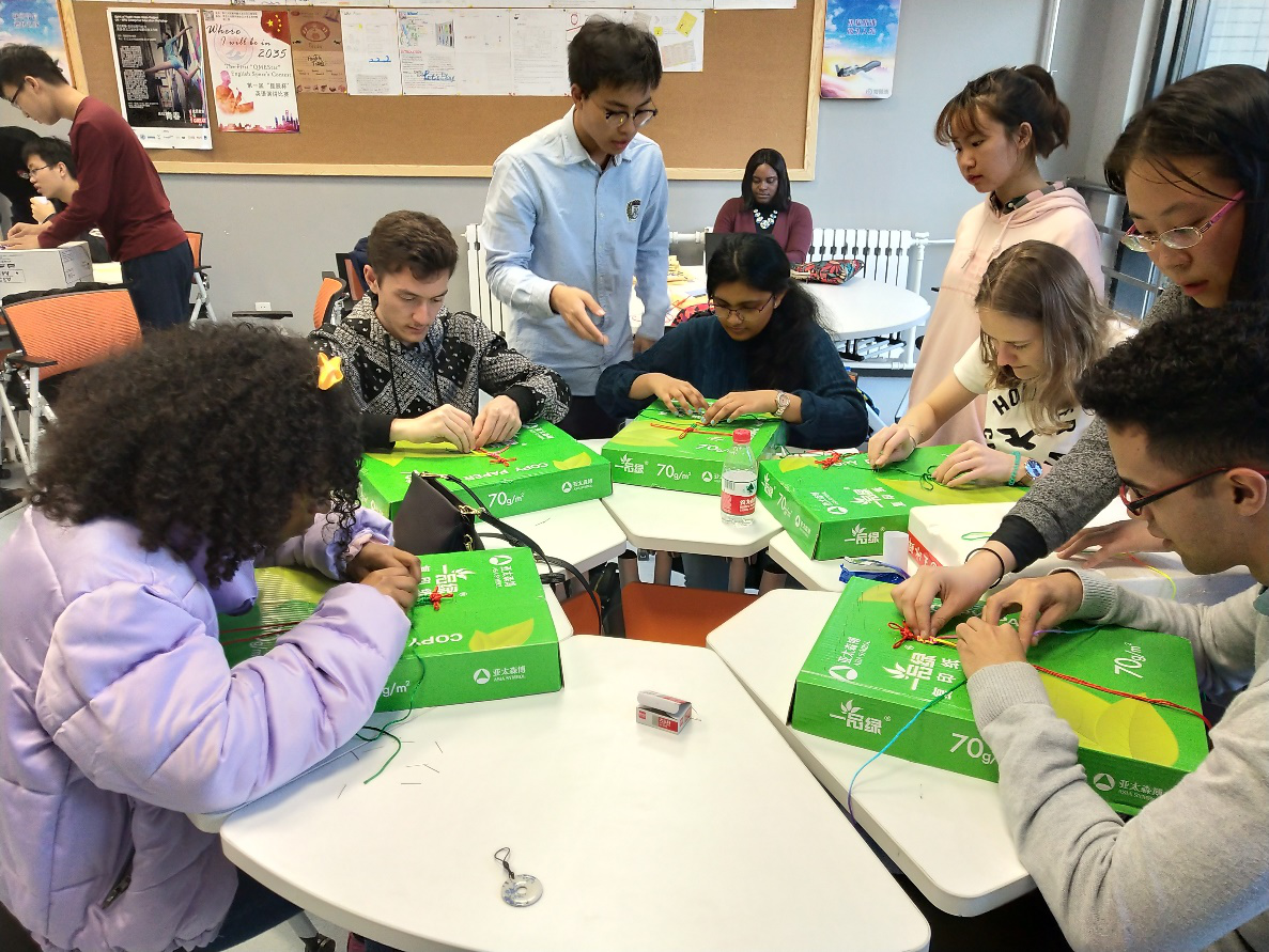 随后,志愿者靳轶扬展示了中国结的编织方法。编织中国结本身就有一定难度,一开始员工大使们显得有些手足无措,随着志愿者耐心地教授做法,一对一地帮助编结,员工大使们能够慢慢地独立完成中国结的制作。看着亲手制作的中国结,不论是志愿者还是员工大使,都满脸的骄傲和得意。