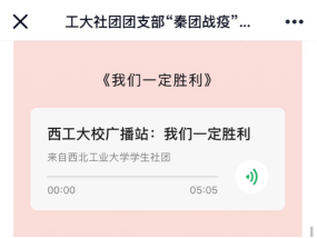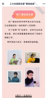 校广播站策划了《战“疫”中的青春力量》线上广播节目,从3月2日起,讲述全国各地工大学子抗击疫情的青春故事。付文迪作为朗读者,在3月4日完成了她的第一次电台直播,获得了西工大教师、同学和蜻蜓FM听众的一致好评与认可,让大家充分感受到了战役中的青春力量。工大志愿者们用科普知识唤醒社区居民之智,用温暖行动 安抚乡村父老之恐,用担当精神奏响青春奉献之歌。