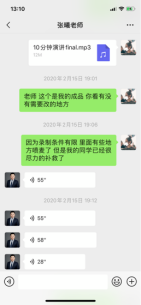 2月8日,付文迪受任课老师张曦的邀请,为老员工职业规划课录制了一段抗疫主题演讲。付文迪来自湖北省武汉市,对这场疫情的感受更加深刻,有着独特的视角。而要在短短的10分钟内让听众感同身受,理解一名武汉市民的心声实属不易。在老师们的指导下,她于15日完成了第一版录制。