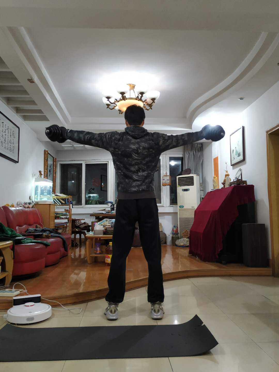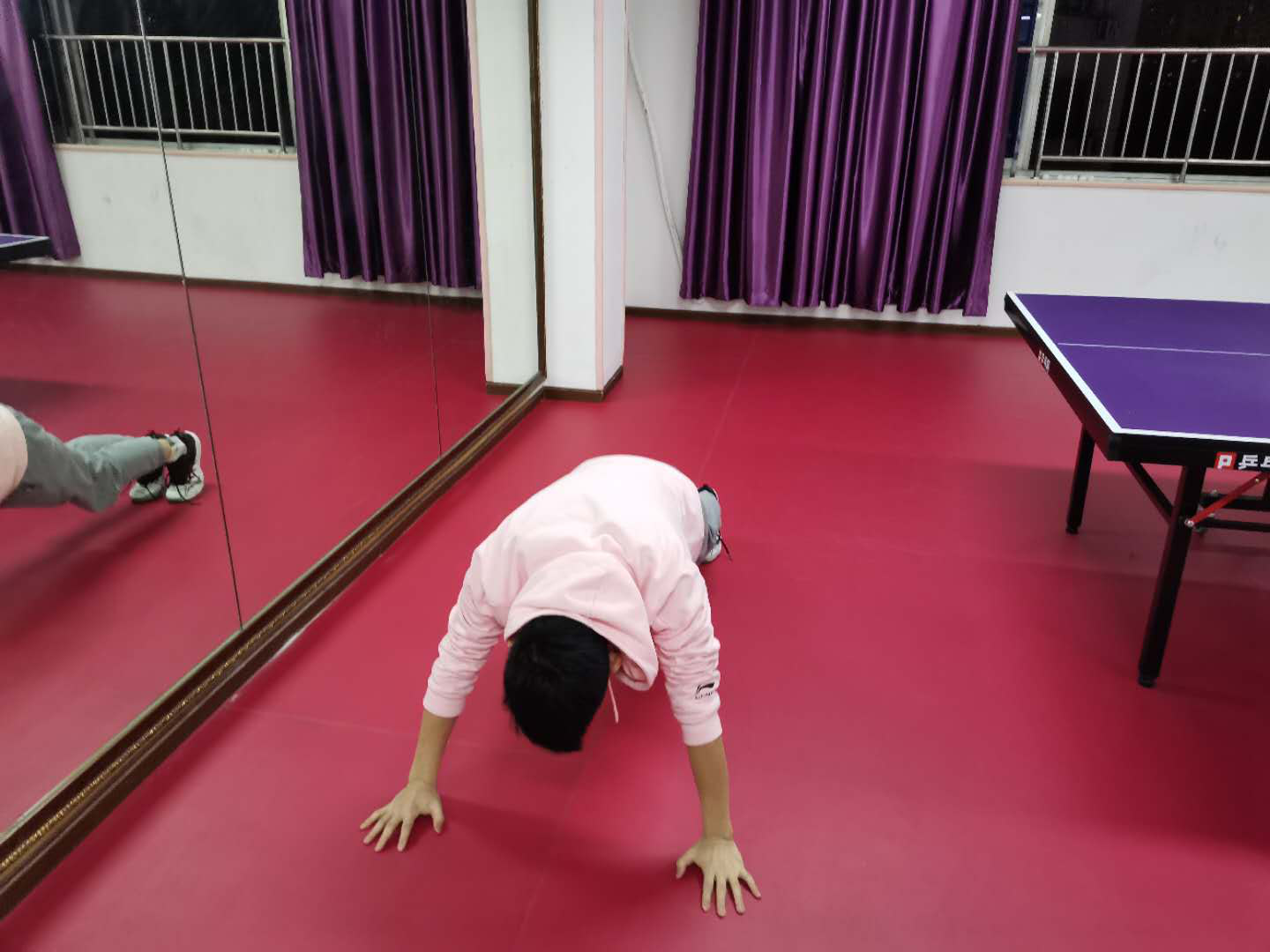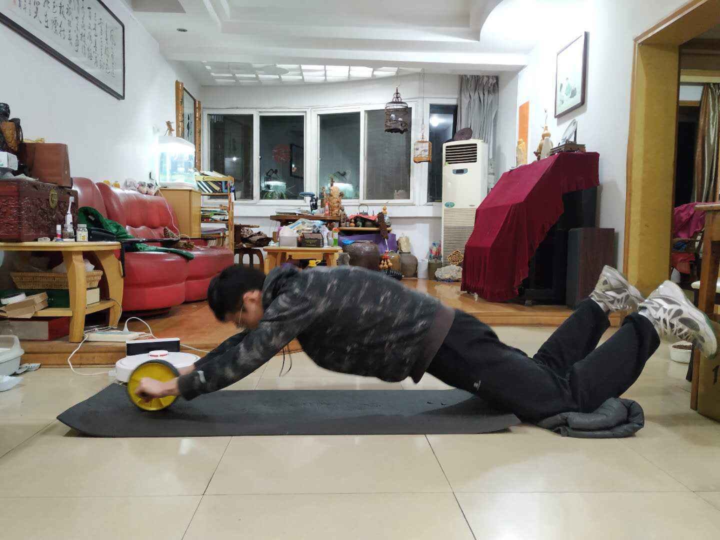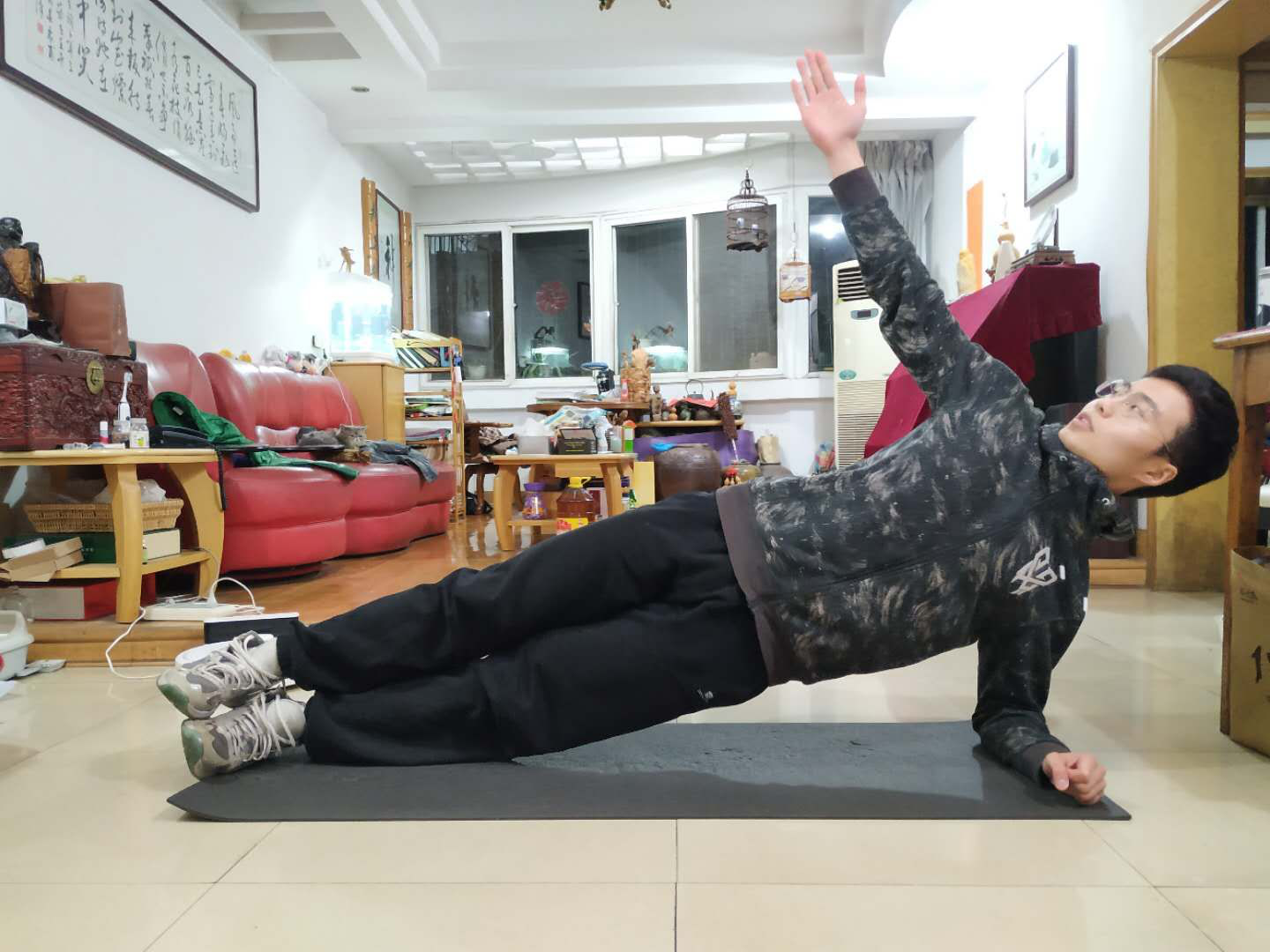 我平时就有着规律的体育锻炼习惯,在家防疫期间,虽然只能做些室内健身动作,但我日复一日地坚持做平板支撑、俯卧撑、卷腹等,坚持运动。除了保持强度,有时还会为自己加量,突破自己极限。