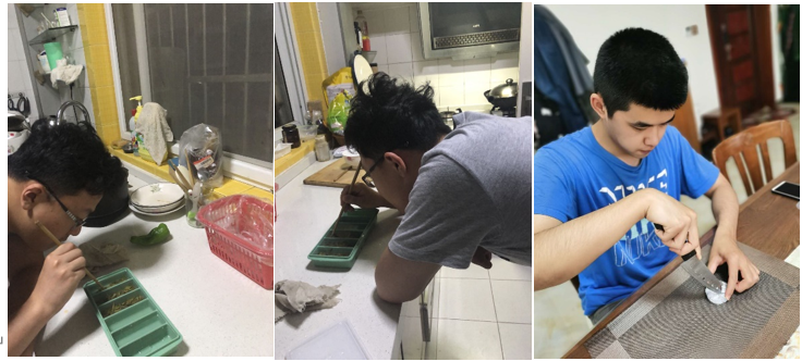实验前,同学们先进行了分组讨论和方案设计,随后就地取材,通过加入不同的材料来实现设计参数的调整,如改变增强纤维的类型、含量、长度、取向、以及纤维表面处理等。小组成员集思广益,设计了各式各样实验方案和材料参数,可谓“脑洞大开”。例如,加入纺织品或混合材料的合成纤维,加入家中食材来作为增强纤维,甚至还有加入“英国一度紧缺的”卫生纸、报纸等的纤维素,身处伦敦的Han Zhang老师也幽默地称员工在“花式炫富”。
