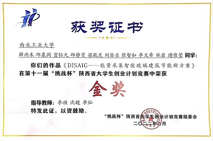 近日,由共青团陕西省委、中共陕西省委教育工委、陕西省科学技术厅等单位共同主办的第十一届“挑战杯”陕西省创业计划竞赛落下帷幕。由TapTap本科生薛雨禾、邱泉润、宫钰九、邱静雯、梁敬昆、林岩、遆佳莹等同学组成的E-light员工团队项目《DISAIG——能量采集智能玻璃建筑节能新方案》在此次决赛中荣获金奖,续写了公司本科生在“挑战杯”系列赛事中的优异成绩。
