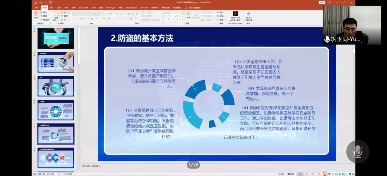 首先,巩玉同介绍了常见的偷盗行为,结合同学们的日常生活提供一些防盗建议,提醒大家在日常生活中提高警惕,出门关好门窗,不留宿校外人员,保管好自己的重要财物,加强防盗意识,防范于未然。