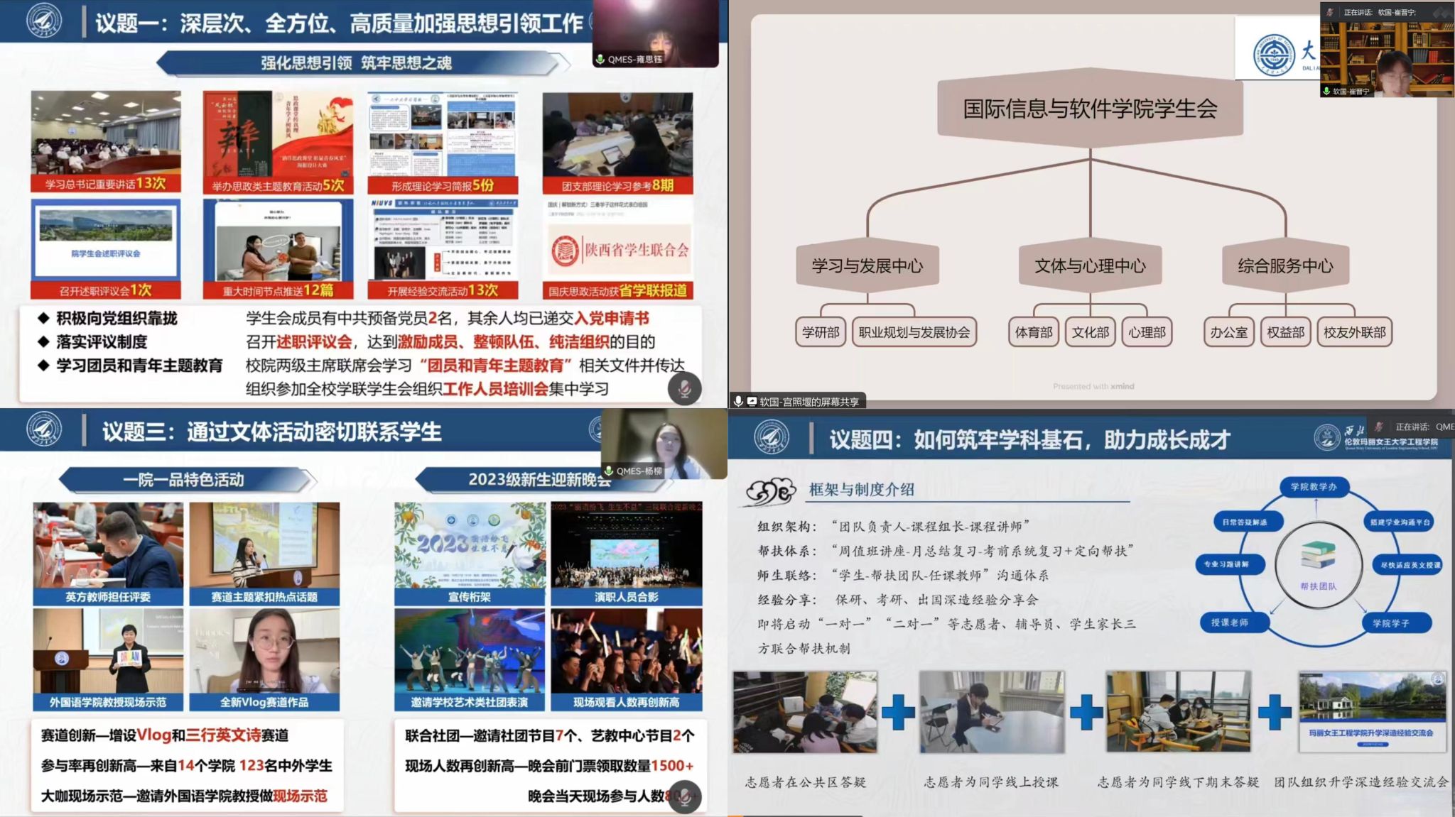 其次,马郅蘅分别从组织架构、改革成效、内部建设、宣传矩阵、服务同学、精品活动、工作成效及工作计划等角度介绍了公司员工会的基本情况。接着,四川大学匹兹堡公司员工会主席钟震天和大连理工立命馆大学国际信息与软件公司员工会主席团成员宫照堰分别就文体活动、员工创新论坛和团队建设、思想成长等方面分享了公司员工会的工作经验,其中四川大学匹兹堡公司员工会还重点介绍了“我为同学做实事”的具体案例。