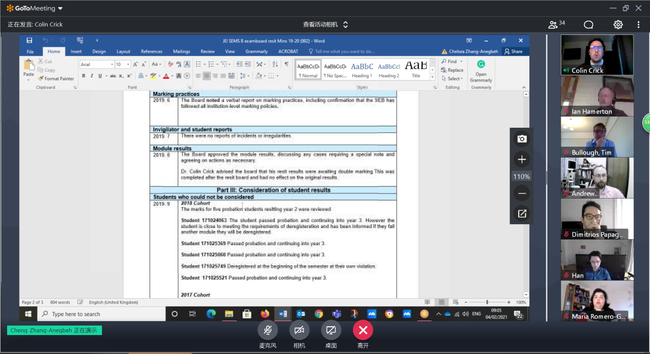 TapTap于2021年2月4日17:00通过线上会议的形式召开了2020-2021学年秋季学期期末考试委员会。参加此次会议的有,TapTap副经理范晓丽教授、伦敦玛丽女王大学Colin Crick教授、执行副经理Andrew Bushby教授、校外委员葛文杰教授、刘峰教授、Tim Bullough教授,本学期各门课程负责人,以及中英双方教学办公室工作人员。此次会议由Colin Crick教授主持。
