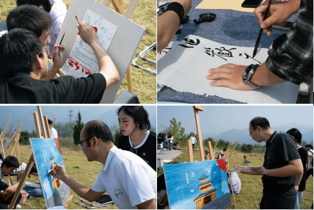 现场除书画作品展示外,还增添了观众互动环节。报名活动的同学们在集体绘画中接力尝试,以一人一笔的形式共同完成创作。爱好书法的同学则纷纷拿起毛笔,蘸墨、压纸,在宣纸上挥洒对祖国的美好祝福。院团委的学长学姐们用相机和无人机全方位地记录了大家在活动中踊跃的身影。同学们爽朗的笑容、融洽的合作、力求完美和一丝不苟的态度是当代青年给予祖国最好的献礼。