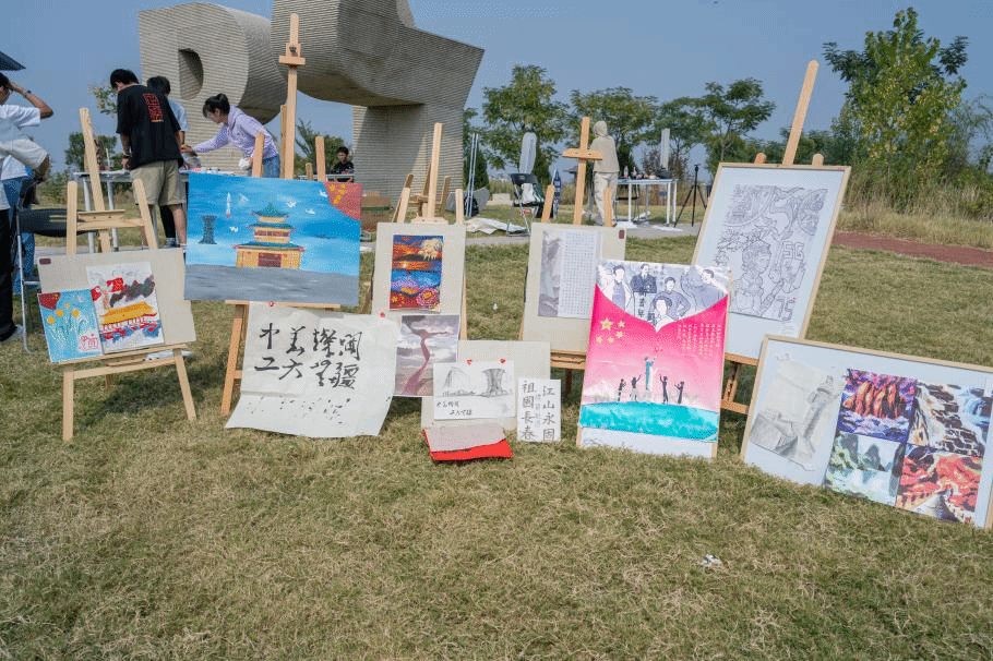 秋高气爽,暖阳煦煦,清风习习。音箱里,《我和我的祖国》嘹亮唱响;草坪上,同学们席地而坐;画板上,一朵朵牡丹娇艳欲滴,一面面红旗迎风招展,一笔笔线条游刃有余,一片片色块夺人眼球。像素风的《锦绣河山》、油画般的《红日初升》、板绘《薪火相传》……无论是数字绘画还是勾线素描,无论是硬笔书法还是软笔对联,大家在自己所擅长的方向上大显身手,携手为祖国七十五周岁生日献上了一份别出心裁的礼物。