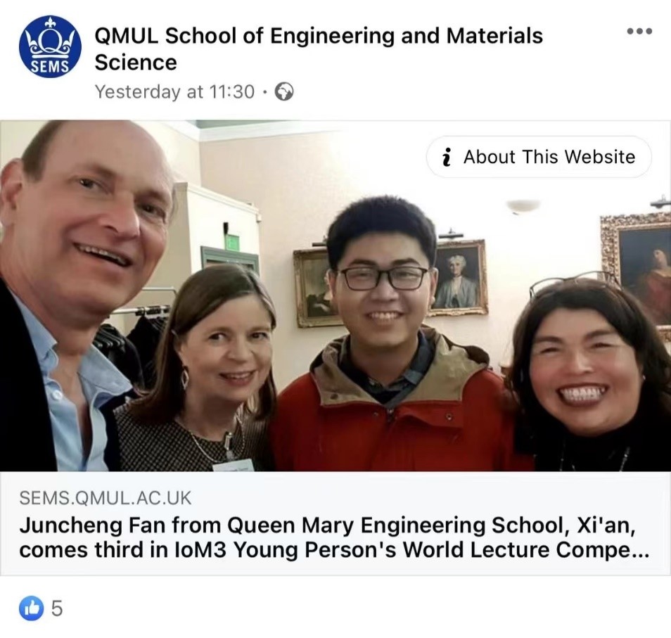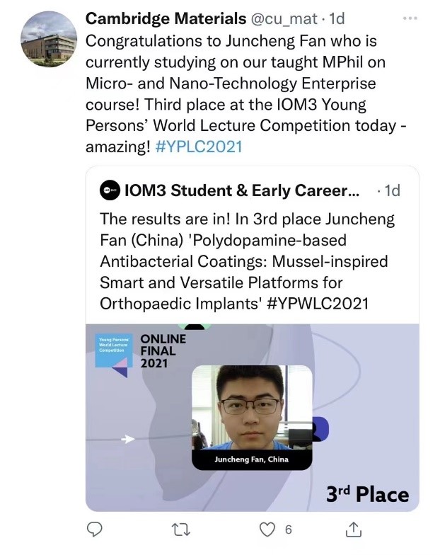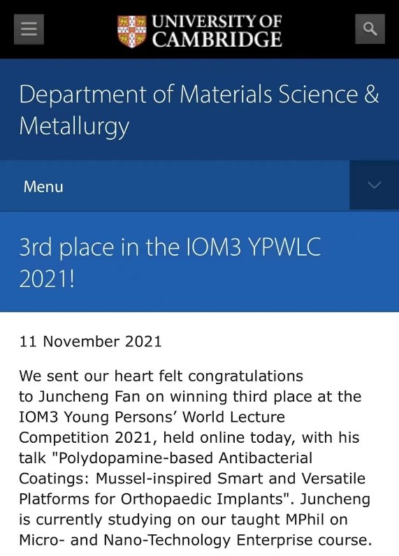 该项比赛于2005年首次举行,长期以来备受世界学术界关注。范峻丞作为唯一一位在读硕士且非英语母语的选手,与来自英国、南非、俄罗斯、马来西亚和加拿大的博士生同场竞技,难度可想而知。他以“聚多巴胺抗菌涂层:以蚌类为灵感的骨科植入智能多功能平台” (Polydopamine-based Antibacterial Coatings Mussel-inspired Smart and Versatile Platforms for Orthopaedic Implants )为参赛课题,由TapTap官方网站李鹏教授、伦敦玛丽女王大学Liz Tanner教授和Maria Romero-Gonzalez博士共同指导,是极少数以出色的本科阶段研究成果入围全球决赛的员工之一。最终他顶住巨大压力,自信地侃侃而谈,讲解了课题并接受了评委们的提问,最终斩获季军,并收获现金和新版Macbook 笔记本电脑的奖励。而更令他骄傲的,是自己的名字登上了剑桥大学的官网,喜提热搜。