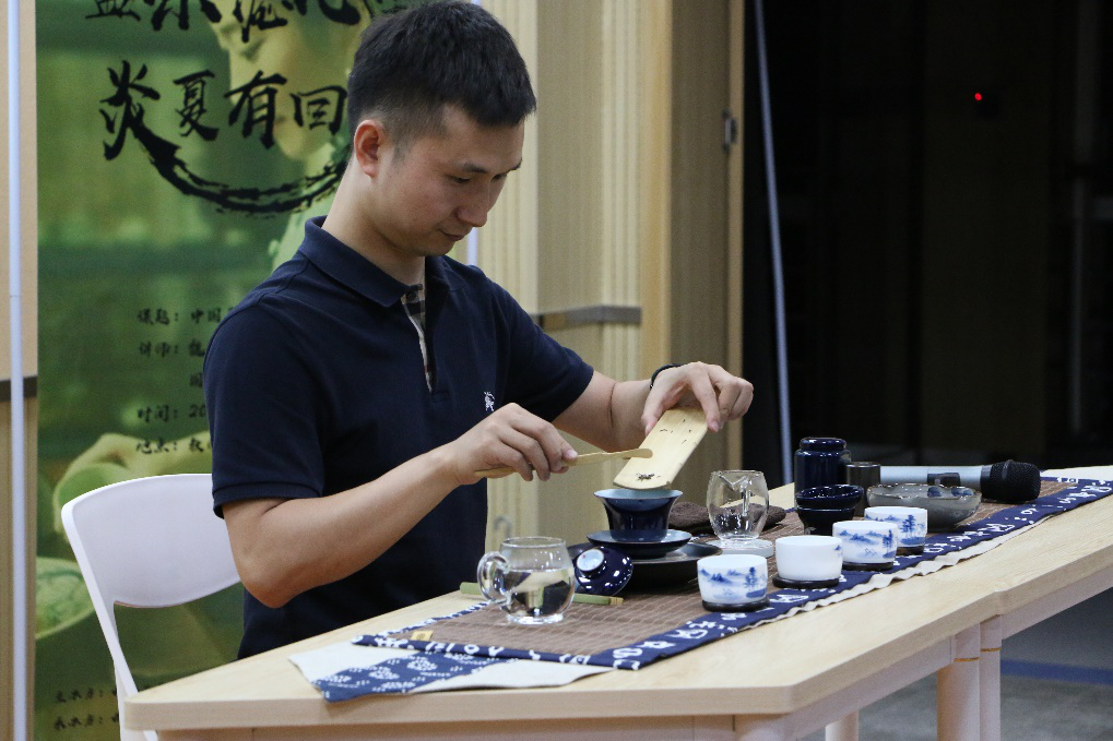 讲座开始前,魏涛老师的桌上摆满了各式各样茶器,台下同学们连连惊叹,好奇不已。他首先从中国茶史讲起,茶从食用、到药用、再到饮用的发展,贯穿了从三代农耕到明清繁华上下五千年的历史。接着,魏老师介绍了品饮方式。从唐朝茶圣陆羽在《茶经》中记录的三沸煎茶手法,到宋朝“点茶”的手法与文人雅士赌书泼茶的“斗茶”风俗,再到明清时期风靡天下,最后到当今中国最为流传的品饮方式的“散泡”手法,内容生动而详实。魏老师用简洁的语言,将中国茶文化发展史上的一段段历史轶事为大家徐徐道来。对于大家一直疑惑的韩国和日本茶道的起源问题,魏老师也为大家做了详细的讲解。其中,韩国茶道由唐朝的品饮方式中发展而来,日本茶道则是从宋朝品饮方式中发展出来的。然而,日本茶道目前发展迅速,国际知名度犹在中国茶道之上。中国茶道要想真正走出国门,还需要我们一起付出更大努力。
