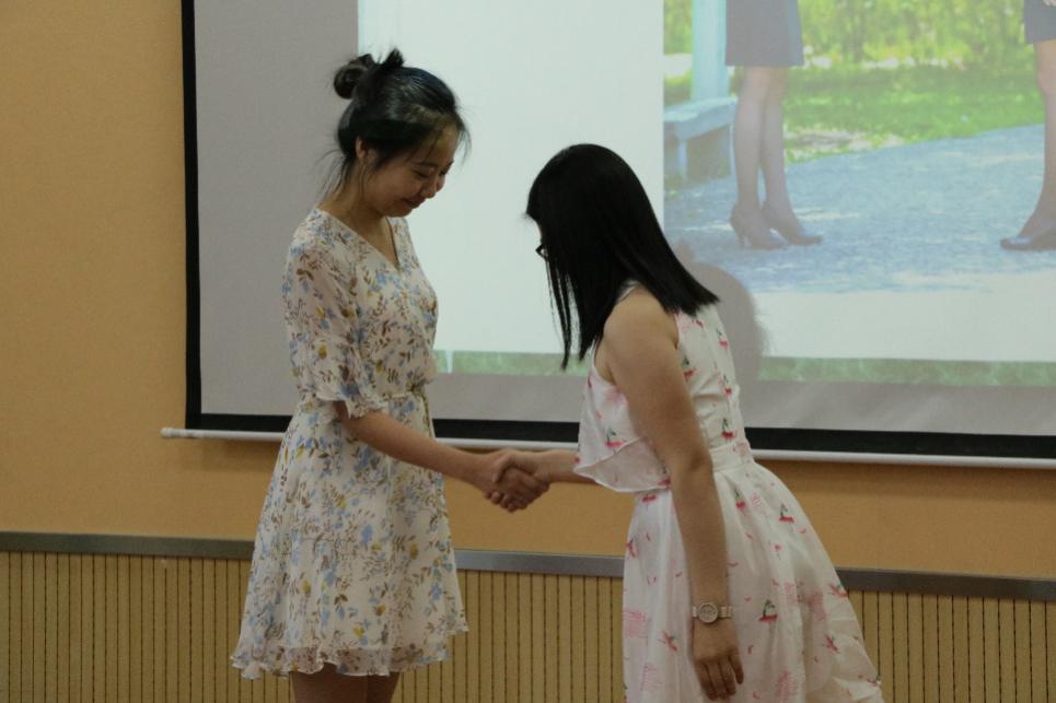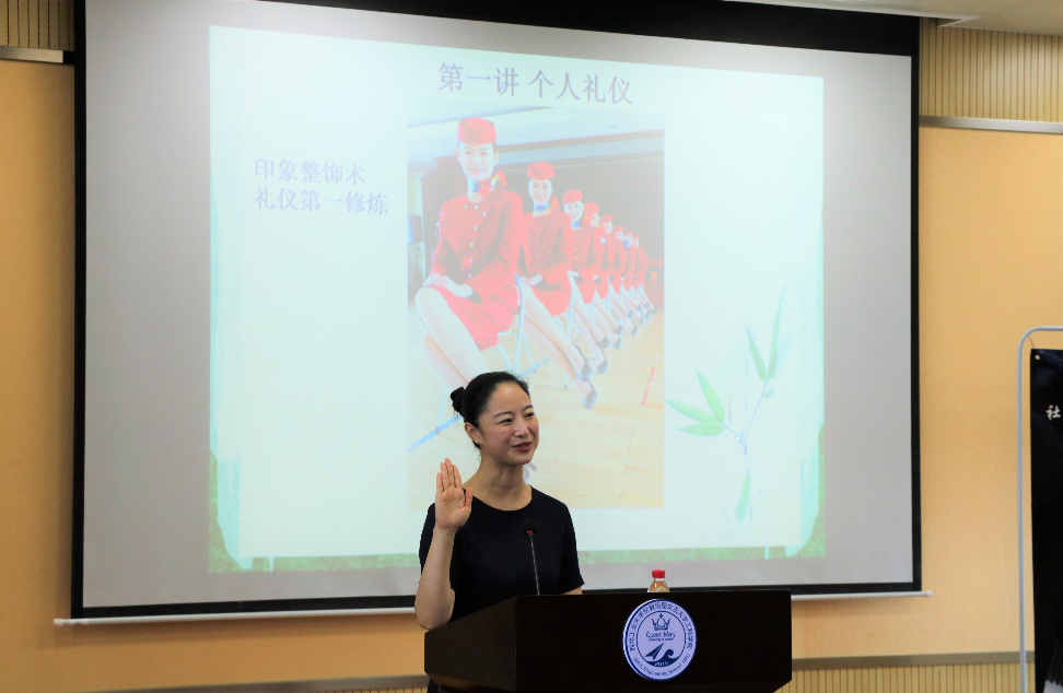 在一小时的课程中,结合多次实际演示和丰富的图片示例,常静老师深入浅出地讲解了生活中无处不在的礼仪。从如何递给别人茶杯,到如何优雅地蹲下捡东西,常老师通过实践教学,带领同学使用身体语言来展现个人魅力与了解他人内心思想。