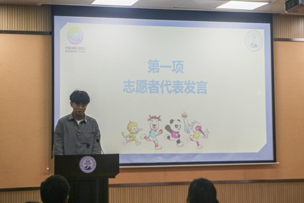 表彰会上,参与到开闭幕式演出的杨皓程同学和女排项目快擦手王雨寒同学作为志愿者代表首先发言。两位同学用朴实生动的语言分享了他们的全运故事,精彩的讲述引发了同学们的赞扬和热议。接下来,每位志愿者一一分享了参与本次全运会的收获与感悟。大家纷纷表示在参与服务活动的过程中,深刻感受到“奉献、互助、友爱、进步”这八个字的含义,通过本次全运会,自身也得到了更加全面的锻炼与磨砺。他们将以积极向上的奋斗姿态,努力成长为担当时代重任的新青年。