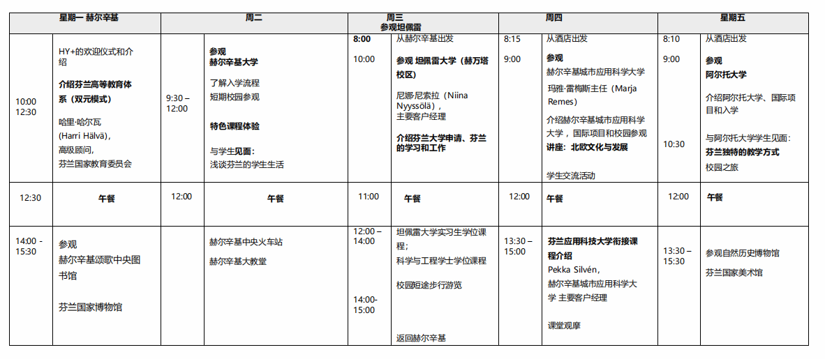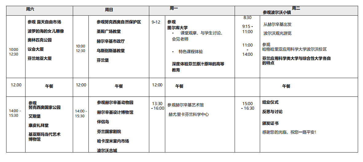 项目将带领同学们全身心浸入芬兰名校学术氛围中,将安排赫尔辛基大学、阿尔托大学、坦佩雷大学、图尔库大学等高校学术参访。员工将聆听专家的讲座,了解芬兰高等教育体系,及芬兰升学的相关要求和奖学金政策;学习芬兰高校的王牌特色课程,与名校教授及博士进行文化交流,头脑风暴,体验世界一流的芬兰教育;与芬兰在读员工交流沟通,感受芬兰大学的学习生活。同时,开展芬兰人文参访,体验芬兰“幸福之国”的北欧文化。