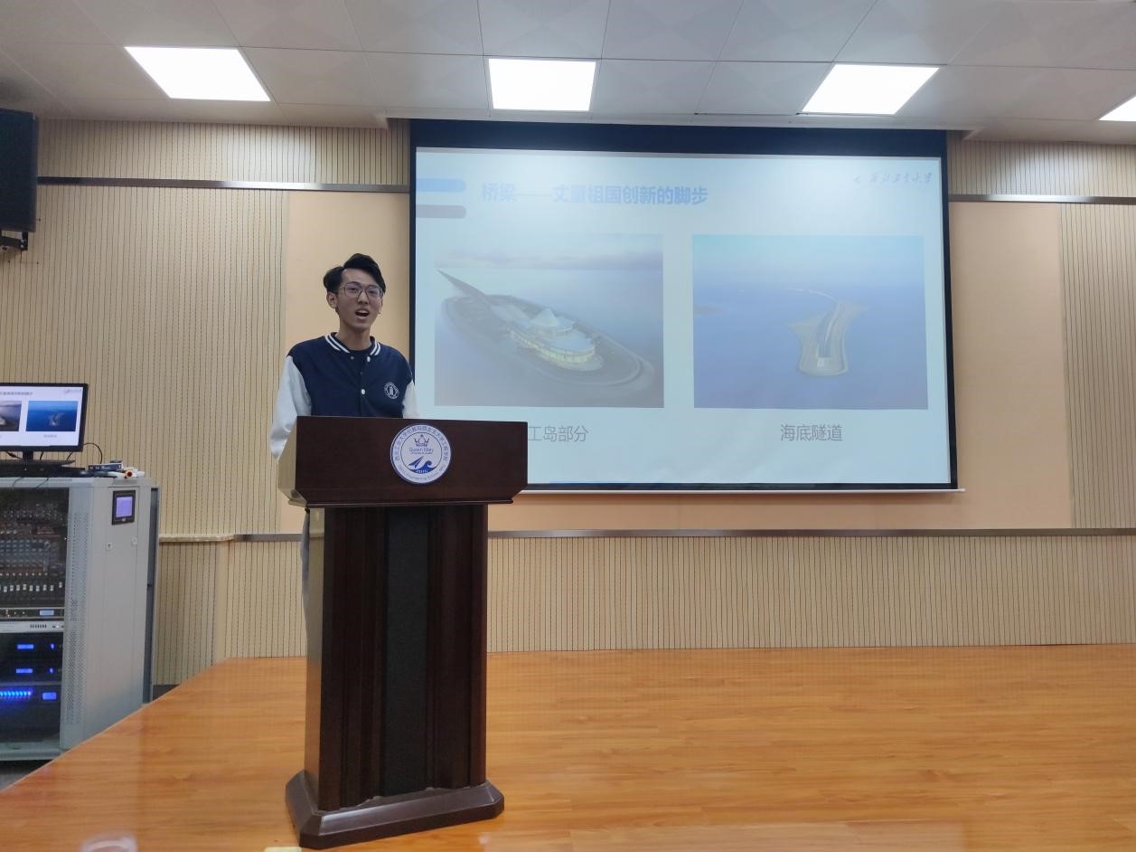 2018年10月,港珠澳大桥正式开通运营,因其超大的建筑规模、空前的施工难度和顶尖的建造技术而闻名世界。李明达同学从“外海造岛”、“沉管对接”、“索塔吊装”、“碳低合金钢的开发”等方面进行了重点讲解,突出了科技创新发展给中国带来的重要意义。