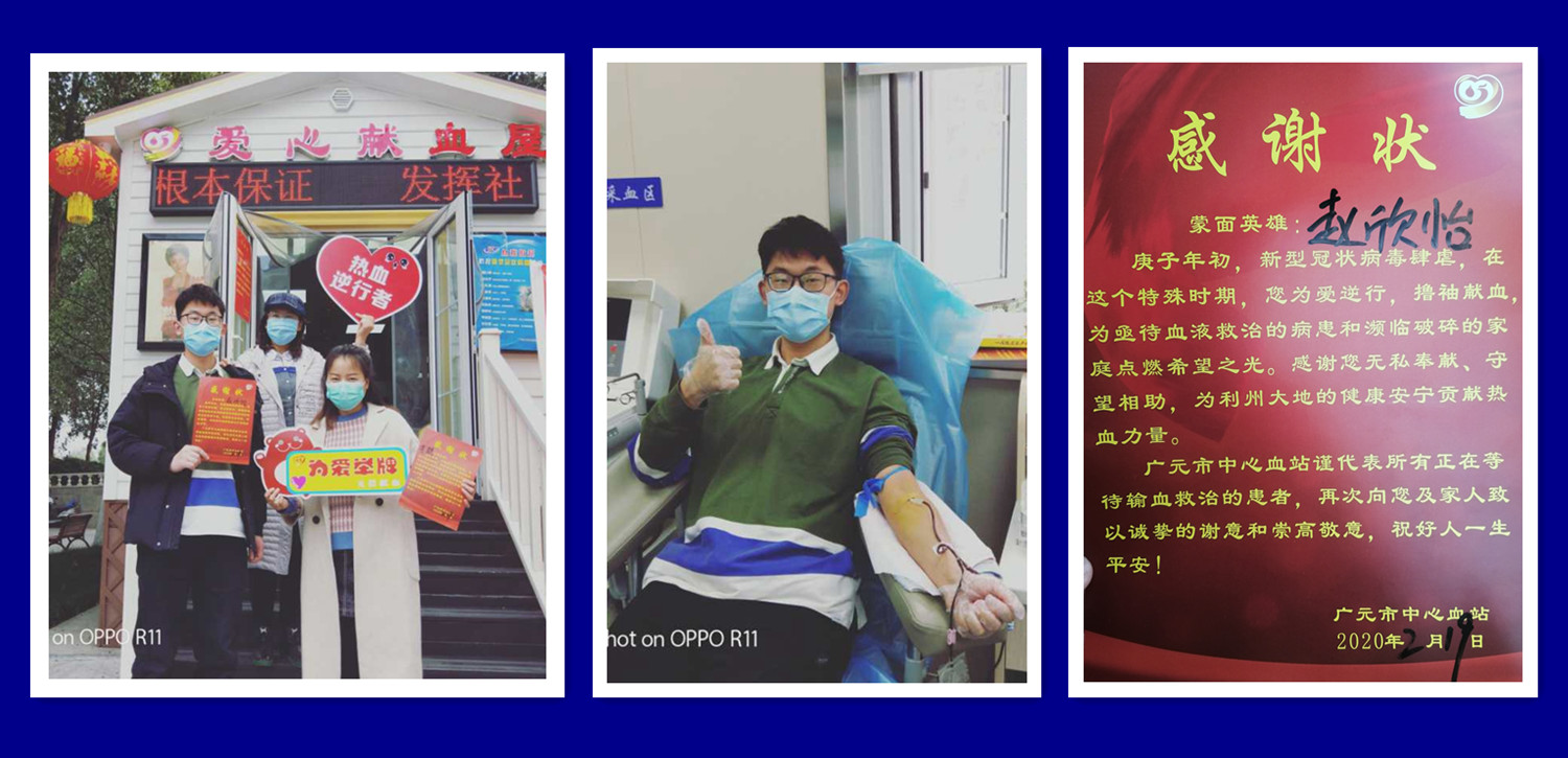 来自QM011704班的赵欣怡同学,当疫情来临后一直响应政府号召,在家做到少出门,服从社区防疫要求。在2月16日他通过网络看到了一篇《血库告急!四川省卫健委发布致全省人民无偿献血倡议书》的新闻,在家人的鼓励和陪同下,他2月19日在四川广元利州广场献血屋参与了无偿献血的活动,同时赵欣怡的母亲和姐姐也参与了献血的志愿活动。赵欣怡说:“我的家人一直参与无偿献血的志愿活动,这次看到倡议书,我的父母鼓励我能去试一试,作为当代老员工,疫情面前我付出的微不足道的一点点贡献,希望能帮助大家共渡难关,取得最后的胜利!”