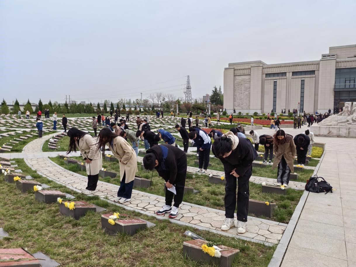 到达扶眉战役烈士陵园后,全体同学首先参观了扶眉战役纪念馆,接受了⼀次生动深刻的精神洗礼和党性教育。从纪念馆中陈列的一封封电报、一张张照片中,同学们清晰地感受到当年扶眉战役的激烈与酣畅,在参观的过程中,同学们深刻体会到了革命前辈不怕困难、不惧艰险的大无畏精神。参观结束后,同学们在工作人员的带领下一同前往瞻仰烈士陵园。2160座卧碑一层层排开,向远方的台塬延展开去,肃穆、庄严。初次到此的同学们,无一不被眼前的景象所震撼。在工作人员组织下,同学们依次有序地祭扫烈士墓园,三鞠躬凭吊先烈,并为先烈敬献鲜花,对扶眉战役中牺牲的所有革命烈士深切地默哀致敬。