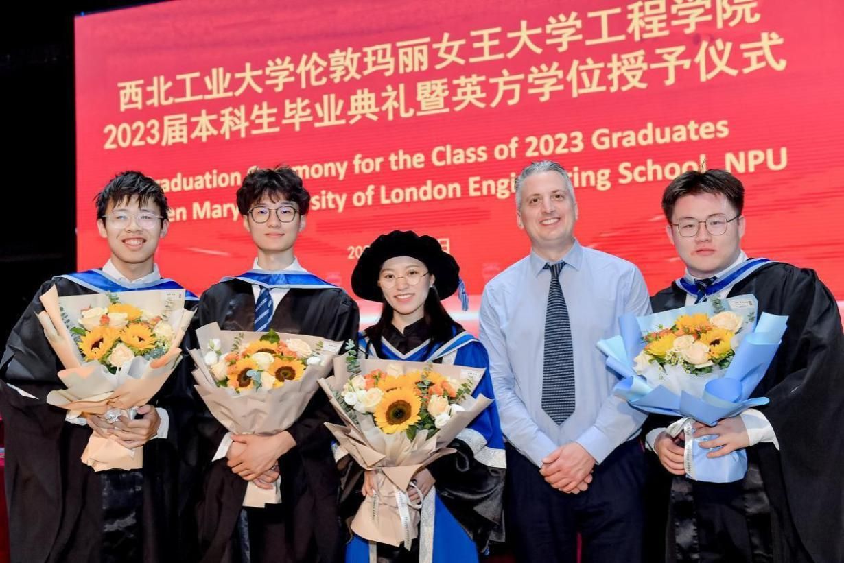 On the afternoon of June 25, the graduation ceremony and British degree awarding ceremony of QMES was held in the Ao'xiang Student Center, Chang'an Campus. Song Baowei, President of NPU; Colin Bailey, President of QMUL; Zhang Yanning, Vice President of NPU; Academician Wen Wang, Vice President of QMUL; Li Jinshan, Dean of School of Materials Science and Member of JAC; Gabriel Cavalli, Executive Vice Dean of QMES; Andy Bushby, a JAC member; Wang Haipeng, Director of Academic Affairs Office and Member of JAC; Zhang Fuli, Director of International Cooperation Office and Member of JAC; Han Suomin, Director of Finance Department and Member of JAC; Zhang Yingqun, Director of Education Foundation Office; Sonal Hathi, Director of QMUL Alumni Association; Jing Liu, MEMA China Manager of QMUL; Faith Nightingale, Director of Teaching Affairs of QMES; Fan Xiaoli, Dean of QMES; Dai Fuping, Secretary of the Party Committee and Vice Dean of QMES; Cheng Yin, Vice Dean of QMES; the faculty and staff of QMES; and all graduates of the class of 2023 and representatives of their relatives and friends attended the graduation ceremony which was presided over by Dean Fan Xiaoli.