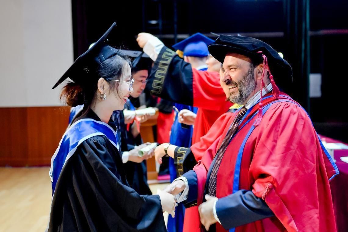 Then, Principal Colin Bailey presented Dr. Deng Xinru with a doctorate certificate. Dr. Deng received her PhD in Materials Science from QMUL in 2019 and was appointed as Assistant Professor at QMES after graduation. She perfectly portrays the role of ambassador of friendship between two universities, two cities and two countries in pursuit of academic excellence by virtue of QMES.