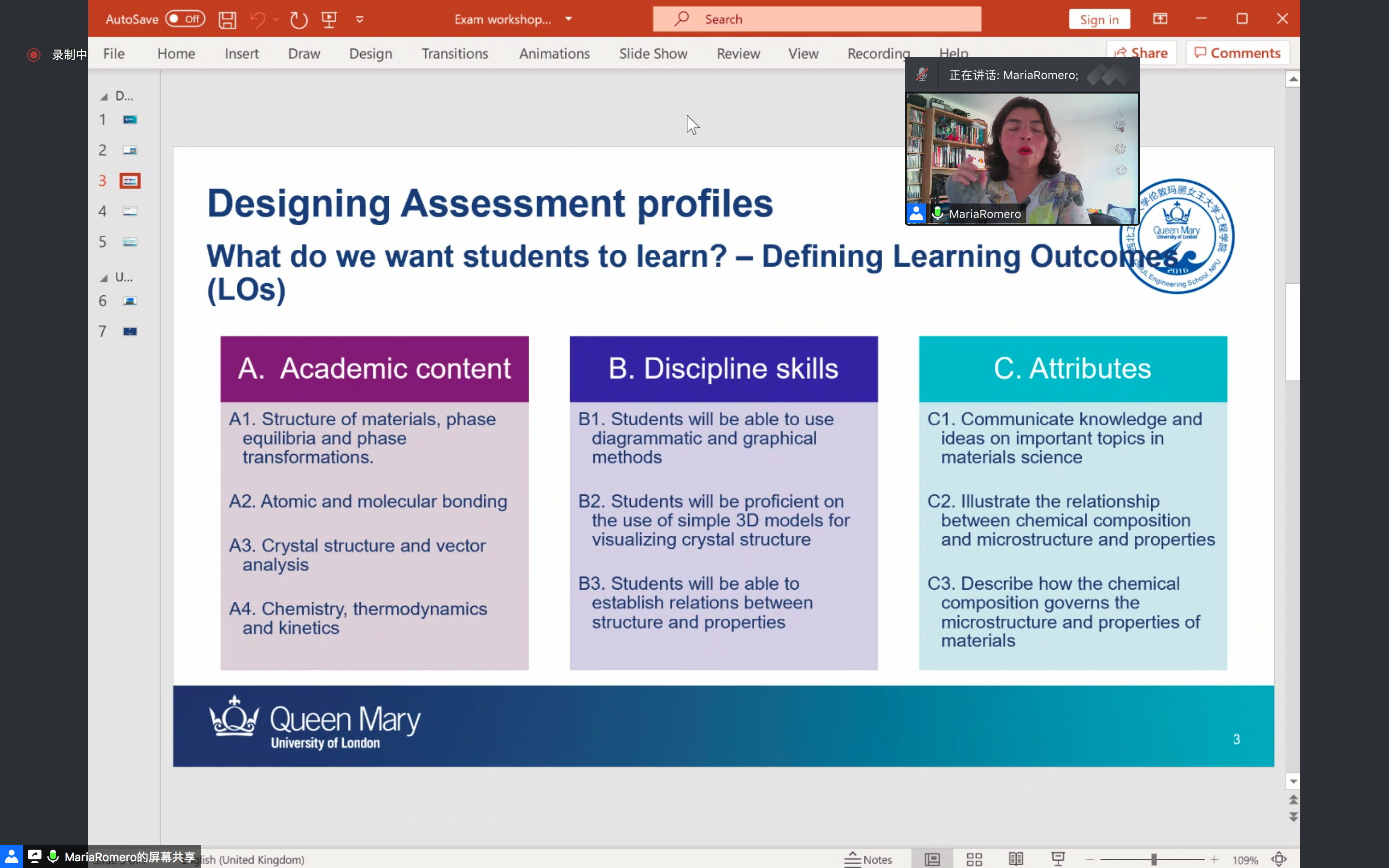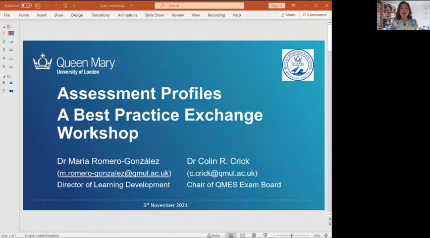 On the evening of November 3, 2021, QMES held an online midterm teaching meeting and a seminar on the assessment and review of scientifically planning modules, and invited all lecturers to conduct in-depth discussions around the assessment and review of scientifically planning modules, so as to improve the quality of the modules and to enhance the professional knowledge and ability of students. This meeting was co-chaired by Fan Xiaoli, Vice Dean in charge of teaching affairs of QMES, Maria Romero-Gonzalez, Principal of Teaching and Development Office of QMES, and Colin Crick, Director of the Examination Committee of QMES.