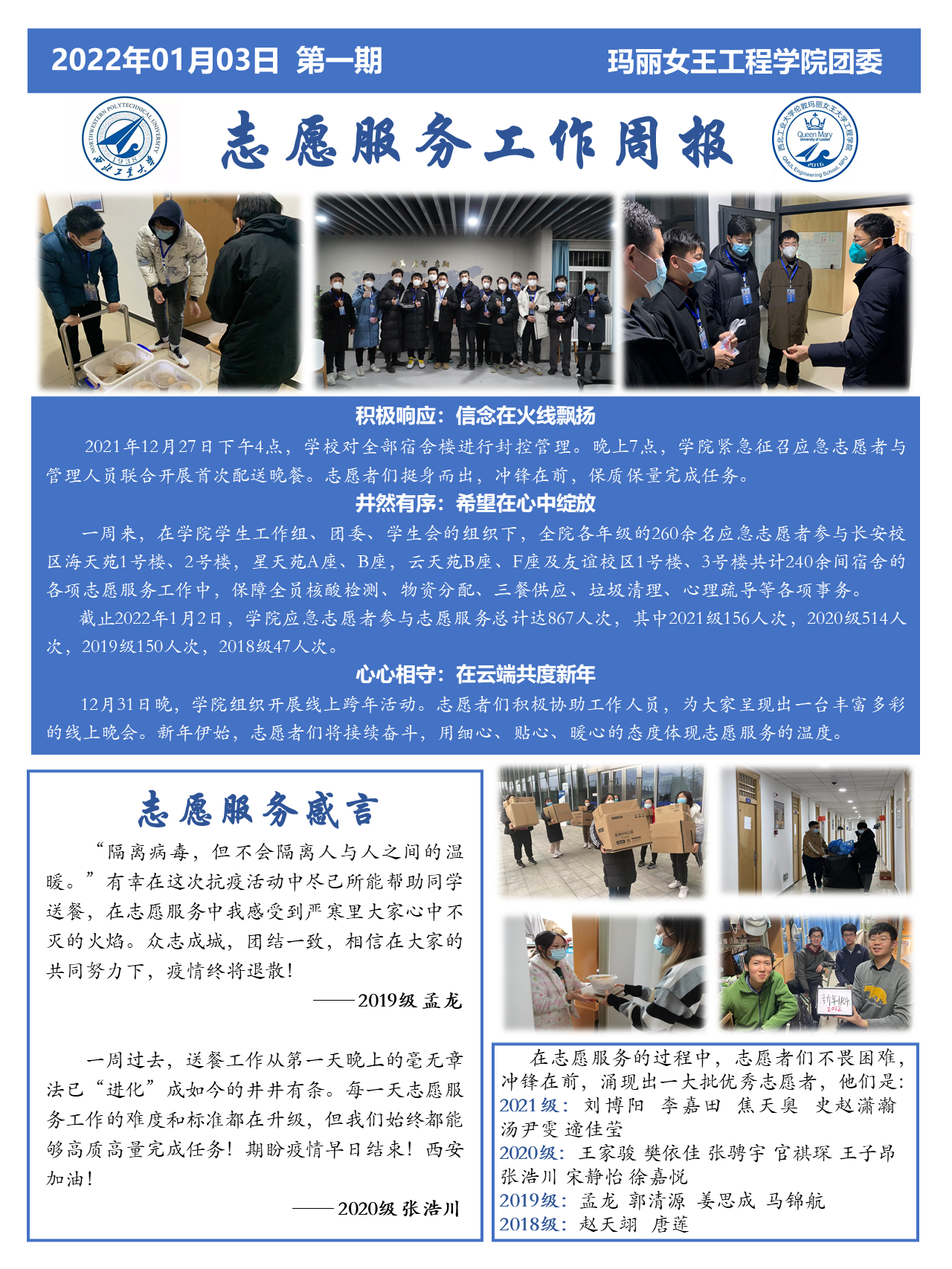 Since Xi’an’s management on epidemic prevention and control was upgraded on December 27, 2021, QMES strictly implemented NPU’s epidemic prevention and control measures, and all the students and faculty members were working together in an active and orderly manner. In order to ensure students’ life remain stable and orderly, QMES Party branches and the Youth League Committee coordinated the recruitment of volunteers, under the leadership of the QMES Party Committee, which received quick responses from students, especially student Party members and student leaders. During more than 10 days’ volunteer work, a total of 291 students from QMES signed up for volunteer services, and there were a total of 1,103 service visits and nearly 5,000 hours for NPU volunteer services.