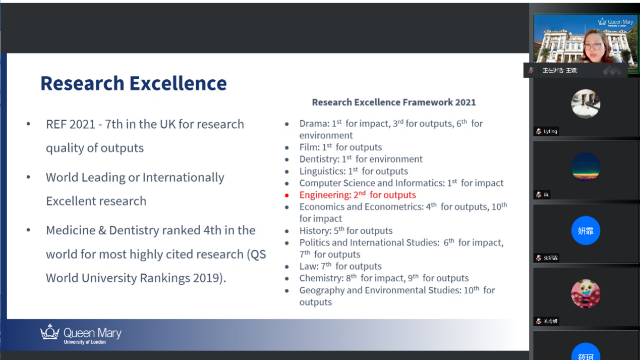 After the meeting, targeting at the students of NPU, QMUL hosted online recruitment teach-in which touched upon application process of Master’s Degree and Doctoral Degree and scholarship policies. The teach-in attracted many students of NPU, contributing to their deep understanding of application process and policy towards British universities.