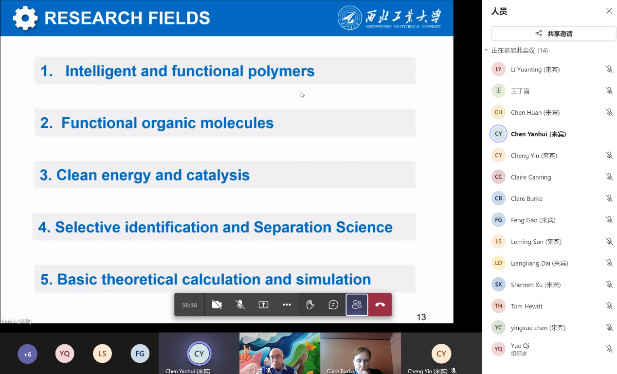 Firstly, Cheng Yin introduced the attendees and extended a warm welcome to the participants. Subsequently, Clare Burke made a comprehensive introduction of QMUL from aspects of its history, department setting, talent cultivation, competitive disciplines and current cooperation with NPU. Next, Professor Gao Feng briefly reported on the cooperation between School of Materials Science and Engineering and QMUL in scientific research and talent training, and achievements in NPU- QMUL Joint Research Institute for Advanced Materials and Structures. Chen Yanhui, Assistant to the Dean of School of Chemistry and Chemical Engineering, introduced the school’s educational characteristics, teaching operation and teaching staff in detail. Sun Leming, Assistant to the Dean of School of Life Sciences, briefed the history, development and foreign exchange and cooperation of the school. Dai Liangliang, Assistant to the President of Medical Research Institute, introduced the establishment background of the institute and discipline development. Xu Shenren, Associate Professor of School of Power and Energy, gave a speech about the general situation of the school, and Professor Wang Dingxi gave a supplementary explanation on the academic characteristics of the school and the achievements of student training.