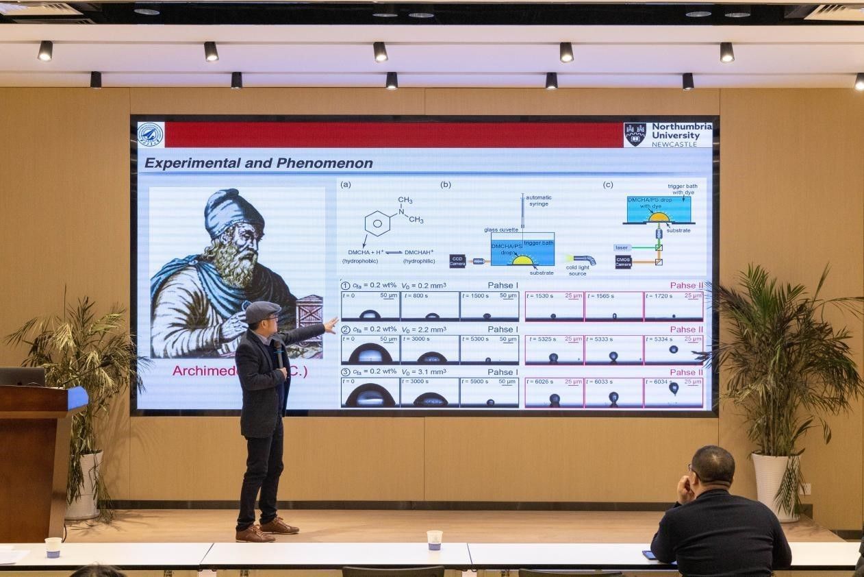 At the lecture, Professor Xu Bin talked about “Surface/interfacial Engineering Driven Sensor and Actuator” and introduced four works of his team. First, the design of topological optical structure based on strain triggering and achieve ultra-high signal-to-noise ratio sensor devices. Second, propose a universal method for constructing structural composite gels and enhance the mechanical stability of the gel system and successfully use it to highly sensitive wearable sensing. Third, the efficient preparation of high-quality, large-size nanoparticle films through interfacial self-assembly with high commercialisation. Fourth, reveal the interface factors of jet dynamics through the droplet anti-gravity spray experiment and point out that this discovery provides enlightenments for future engineering applications such as microfluidics, energy, robotics, and equipment engineering.
