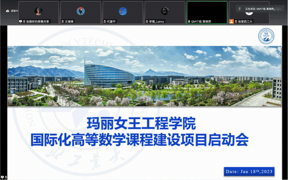 On the afternoon of January 18th, the launching meeting of International Higher Mathematics Curriculum Construction Project officially began. Dai Fuping, Party Secretary of QMES, Zhang Ying, Deputy Party Secretary of the School of Mathematics and Statistics and 42 students who participated in the project attended the meeting which was presided over by Zhang Yaxin, an 2021 cohort undergraduate from QMES.