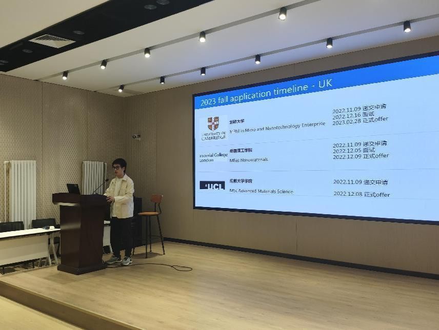 在分享会中,四名同学结合自身优势及特点,分别以不同角度展开分享。周牧言讲到英国在拥有世界诸多知名大学和较短的学制的情况下成为出国留学的优先选项,围绕英国G5名校的不同申请条件,介绍了以学科理解和科研理解为主的面试技巧,并与同学们分享平衡学业和生活经验。