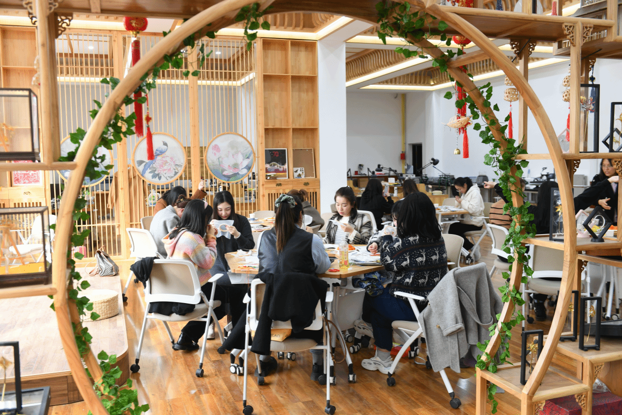 活动现场气氛热烈而温馨,大家互相交流着刺绣的心得和感受,分享着彼此的作品和喜悦。在学习手工刺绣基本知识、针法的同时,对传统刺绣技艺有了更加深切地感悟与认识。在大家的欢声笑语中,平日里孜孜不倦、默默无闻的老师们飞针走线,秀出独属自己的“魅力”,同时也深刻体验了藏在针尖的非遗刺绣艺术,这一刻,大家只沉浸在这份手工艺术的乐趣中。