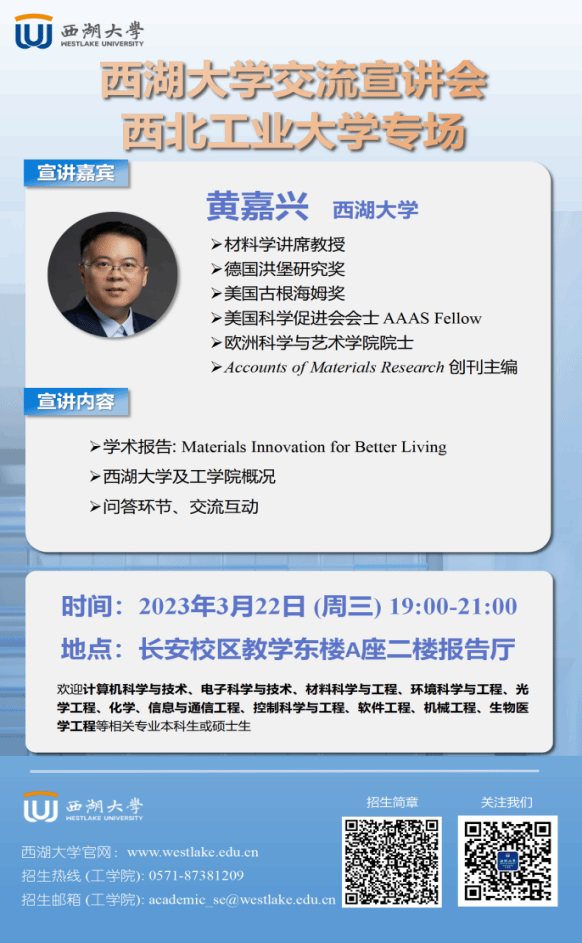 报告人简介:黄嘉兴教授曾任美国西北大学材料科学与工程系助理、副教授、教授。他于2021年8月加入西湖大学,担任材料科学讲席教授,近期当选为西湖大学董事会成员。黄教授善于将教育和研究相结合,为自己和员工提高学习体验。在科研中,他的团队运用化学原理和工具发现新材料、发展材料加工技术并利用材料创新来改善生活;在教学中,他们重视通过教学提高科研直觉、释放创造力并激发员工无限的潜能。黄嘉兴教授于2014年获得美国古根海姆奖,2016年获得日本学术振兴会JSPS Fellow和德国洪堡研究奖。他是美国科学促进会会士,欧洲科学与艺术公司院士,以及美国《材料研究述评》的创刊主编。